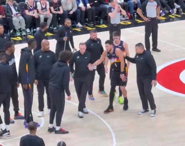竞彩网-一场伤俩!布克右脚踝严重扭伤 被队友搀扶回了更衣室!