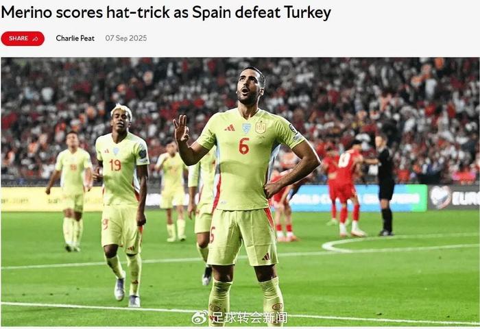 西班牙在世预赛中6-0大胜土耳其,此役祖比门迪和梅里诺均首发登场,前者出战73分钟,后者踢满全场并完成帽子戏法!第三球大禁区外搓射美妙世界波破门!